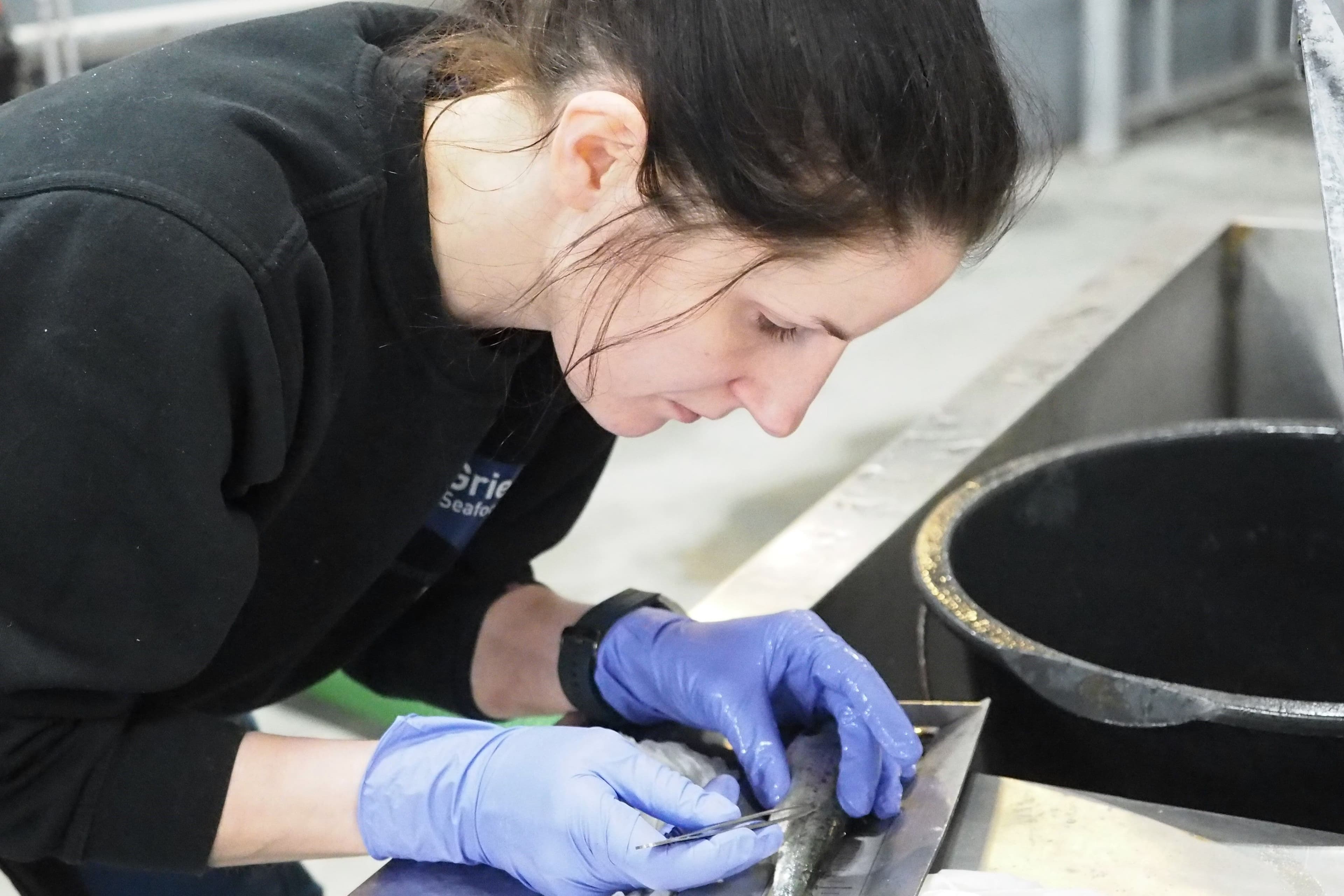 Hovedbilde: Skjellprøvene som Linn Anita tar ut, er som et fingeravtrykk. På den måten kan vi spore laksen til vårt anlegg om det skulle oppstå situasjoner med rømming.