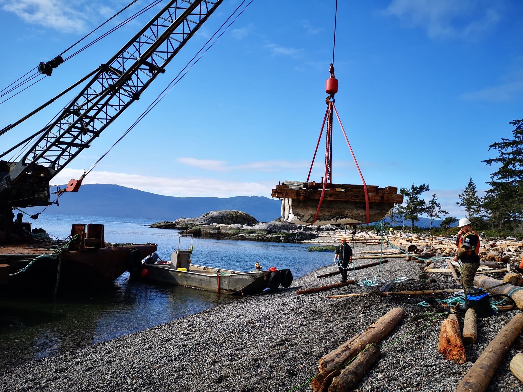 Luckily Grieg had access to a Diversified Marine barge nearby, and on Thursday, Operations Manager Mike Crivea sent a crew of four over with the barge team to clean up the beach and remove the old floats and debris.