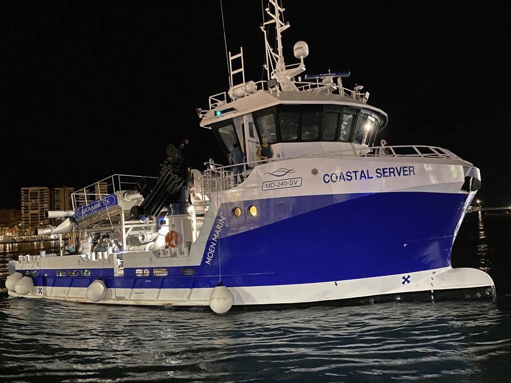 The Coastal Server is a NabWork 2411 vessel, and is 24 metres long, 11.4 metres wide, and is equipped with a 12-cylinder Caterpillar engine and two cranes. It has six single cabins for housing the crew, along with a galley and common area.