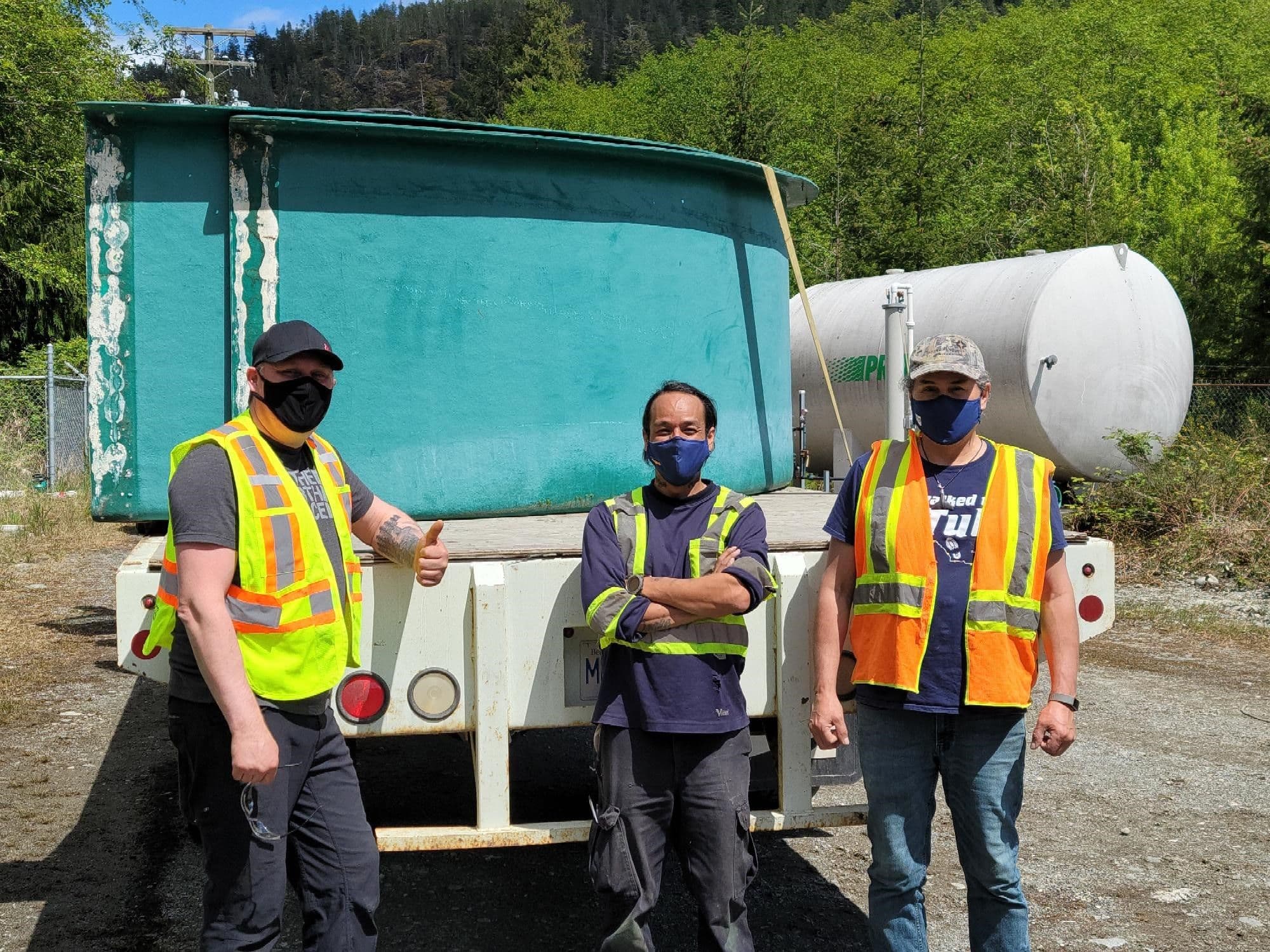 Representatives from the Ehattesaht, the Nuu-chah-nuth Tribal Council (NTC), DFO and Grieg began discussing upgrades and options for the Zeballos Hatchery a year and a half ago. They decided the priority was to remove the existing steel tank, which was posing a risk, and, once it was determined a tank from Grieg would fit the requirements of the hatchery, a date was set to replace the old steel tank.