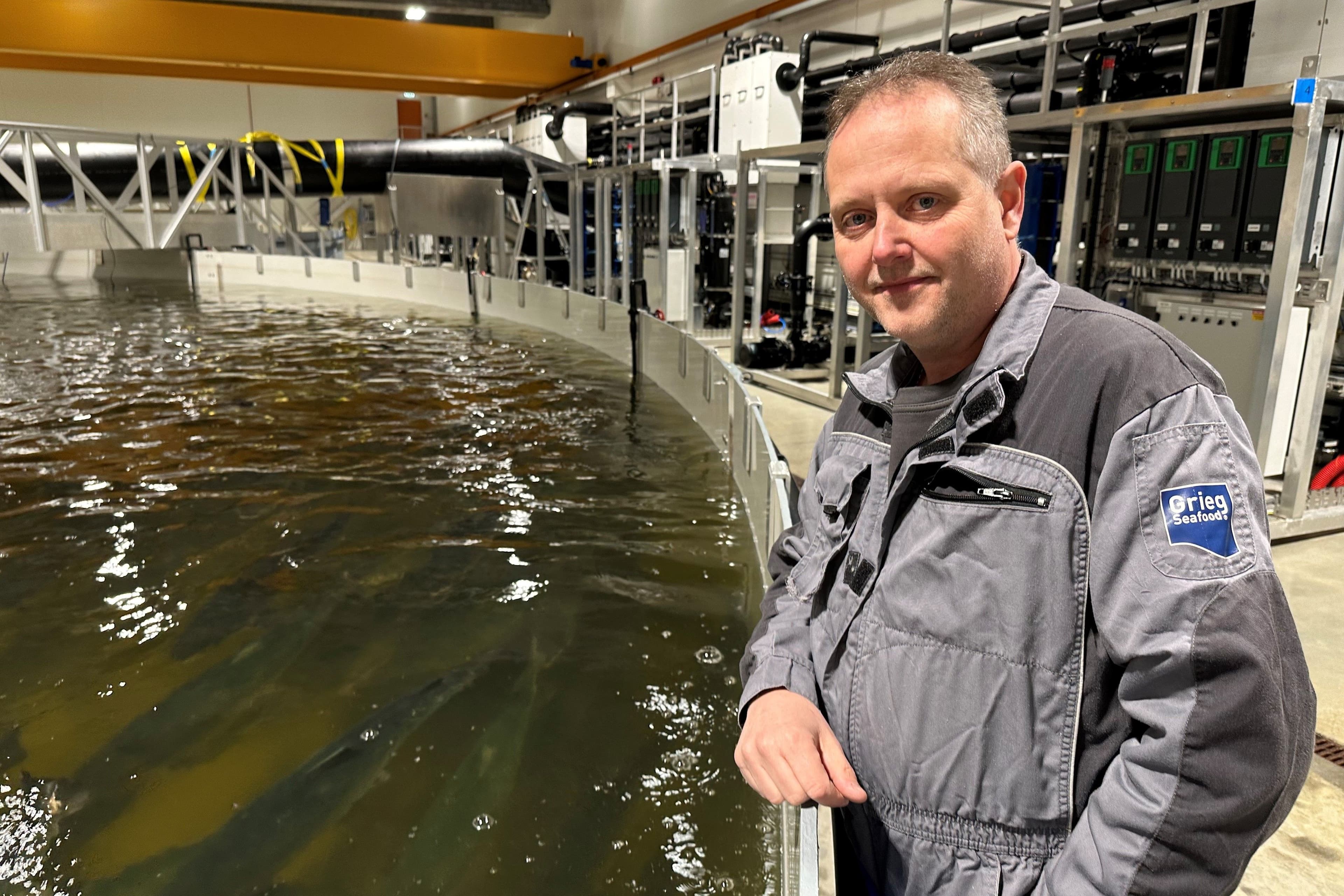Ved Grieg Seafood Rogaland sin avdeling Erfjord Stamfisk, svømmer foreldre til mange millioner nye laskeindivider som skal unnfanges. Driftssjef Terje Bremnes står ved et av de enorme karene som rommer de 12 kilo tunge fiskene det drives avlsarbeider på.